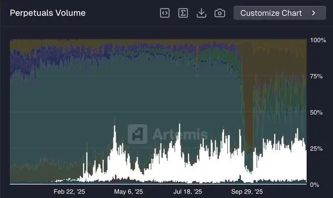 按 @artemis 提供的永续合约交易量市场份额数据